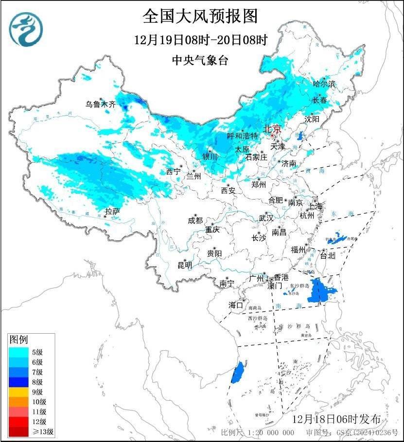 r预计,12月18日08时至19日08时,新疆东部、内蒙古中西部、青海南部、西藏北部、吉林中部、辽宁北部、山东半岛等地部分地区有5~6级、阵风7~8级的大风,其中,新疆山口地区阵风可达8~10级;渤海、渤海海峡、黄海北部和东海南部部分海域将有7级、阵风8~9级的大风,台湾海峡、巴士海峡、南海东北部和西南部部分海域将有7~8级、阵风9~10级的大风。12月19日08时至20日08时,新疆东部、内蒙古、青海、西藏北部、宁夏、甘肃东部、陕西北部、山西北部、河北北部、吉林中西部、辽宁北部、山东半岛等地部分地区有5~6级、阵风7~8级的大风,其中,新疆山口地区阵风可达8~10级。中央气象台于12月18日06时发布大风蓝色预警。