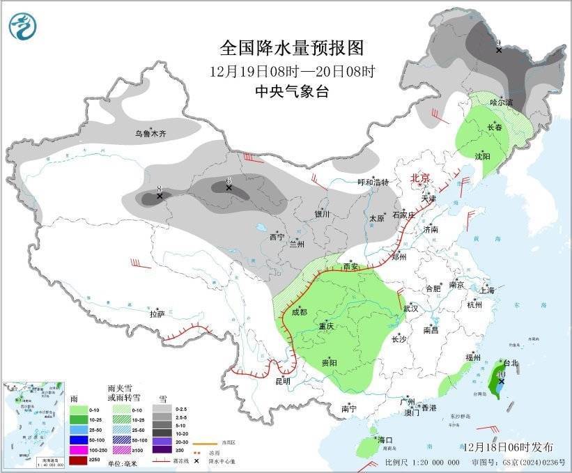 r12月18日08时至19日08时,新疆北部和西部、内蒙古西北部和中东部、甘肃河西、青海北部、黑龙江、吉林中部、辽宁北部、河北北部等地部分地区有小到中雪或雨夹雪,其中,新疆沿天山地区和伊犁河谷、内蒙古东北部、甘肃河西、黑龙江西北部等地部分地区有大到暴雪(10~15毫米)。辽宁中部、四川东北部和南部、陕西西南部、云南中东部、贵州西南部、广西西部、广东东南部、福建东南部、海南岛、台湾岛等地部分地区有小到中雨,局地有大雨(25~30毫米)。新疆东部、内蒙古中西部、青海南部、西藏北部、吉林中部、辽宁北部、山东半岛等地部分地区有5~6级、阵风7~8级的大风,其中,新疆山口地区阵风可达8~10级。渤海、渤海海峡、黄海北部和东海南部部分海域将有7级、阵风8~9级的大风,台湾海峡、巴士海峡、南海东北部和西南部部分海域将有7~8级、阵风9~10级的大风。